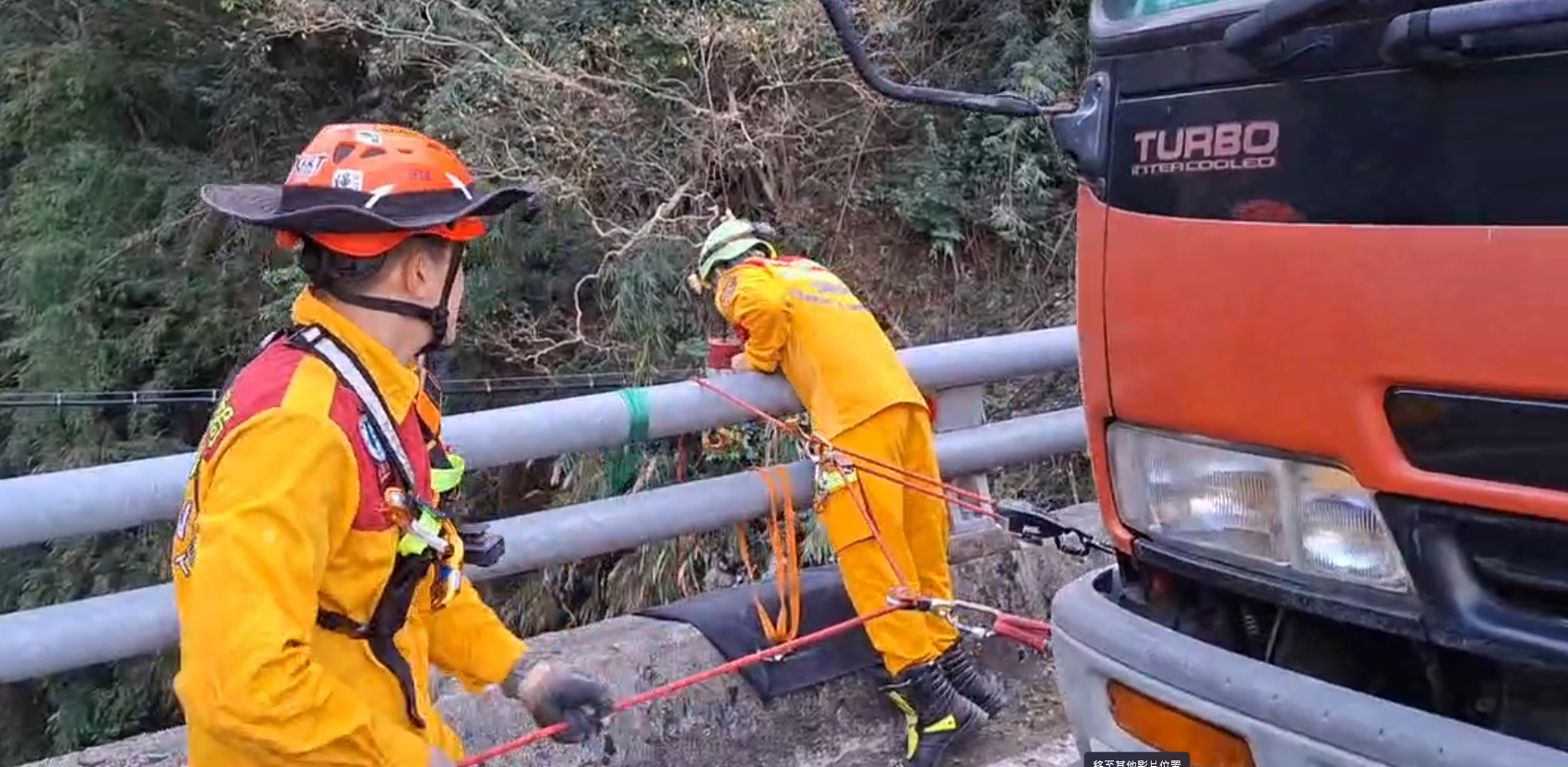 屏東縣消防局指出,今日14時36分獲報霧台鄉台24線第二號橋車禍,現場有1名機車騎士墜落30公尺深的橋下,派遣特搜大隊、霧台及三地門分隊共計5車8人前往,現場指揮官為特搜大隊副大隊長鄭維勛,到場後搜救人員立即架設繩索下降接觸傷者,順利將人員吊掛至橋面上,傷者女性OHCA,由霧台分隊救護車送往屏東榮總龍泉分院急救。
