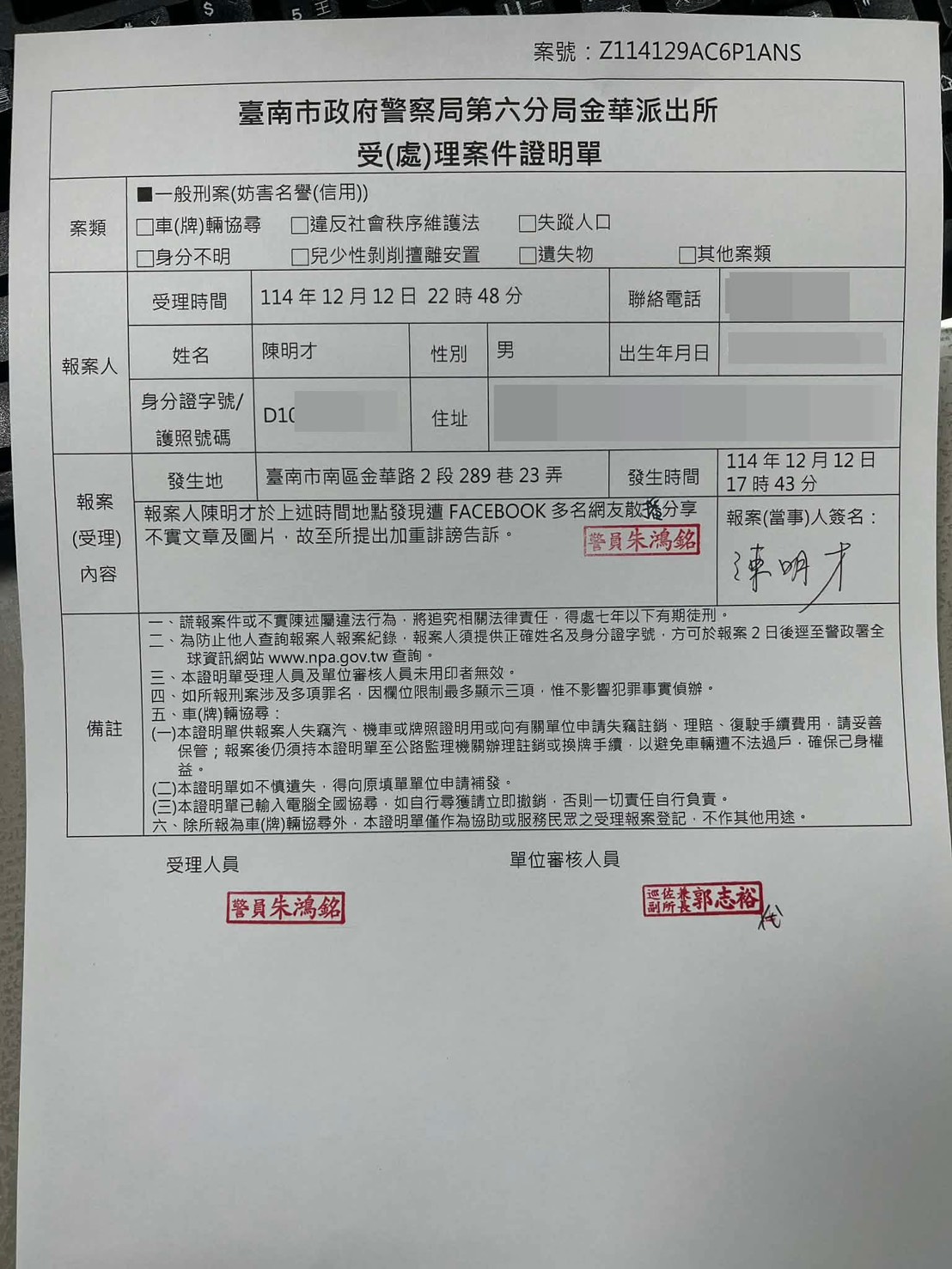▲議長邱莉莉秘書陳明才12日晚間前往第六分局向散佈不實謠言的人提告加重毀謗罪。(記者黃雋淮 翻攝)