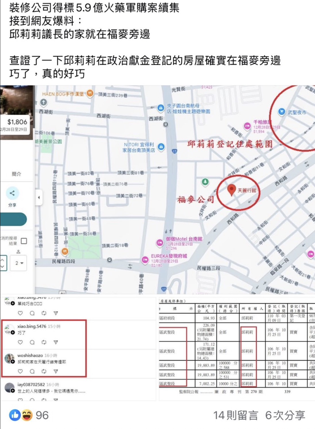 蔡姓網友在13日再度發文,還圈出福麥公司地址與邱莉莉登記住處地址,嘲諷式指出邱莉莉政治獻金登記的房屋就在福麥公司附近,並稱「巧了,真的好巧」,似有意連結雙方關係。