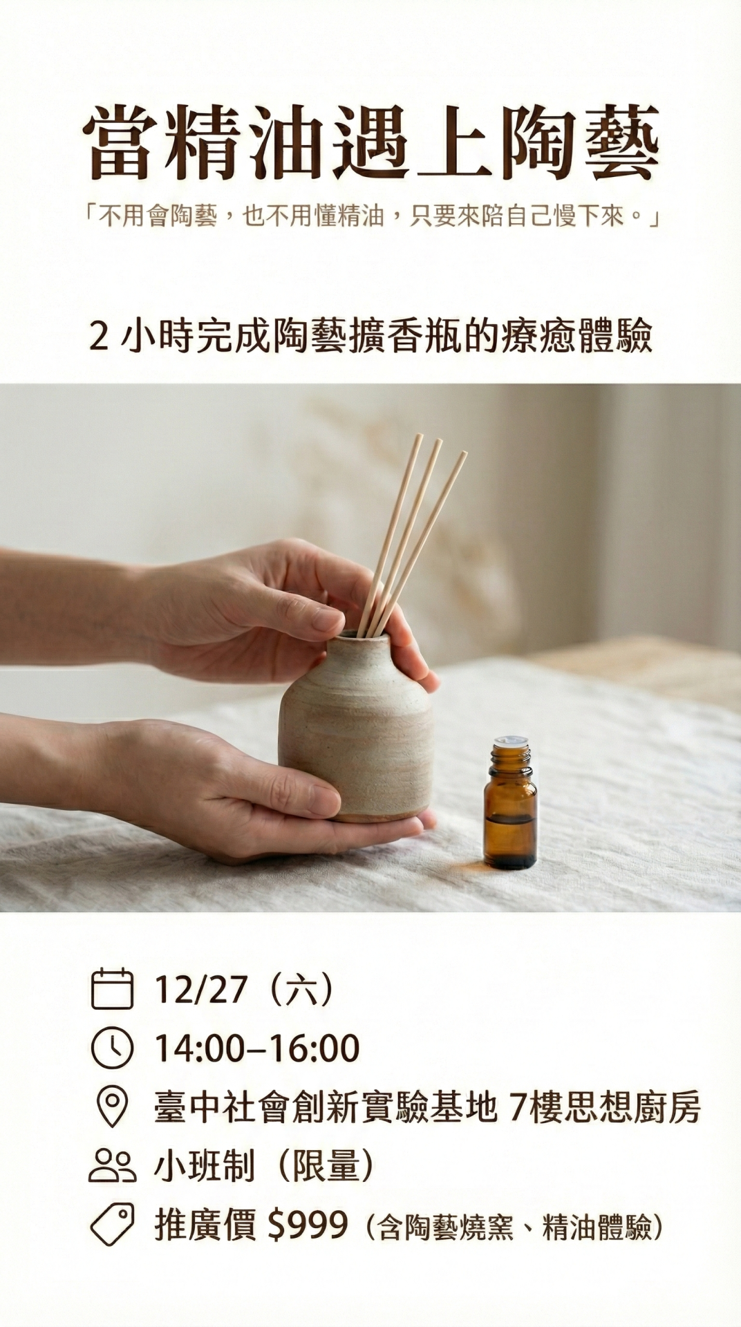 在快節奏的現代生活中,尋找身心靈的平靜成為許多人的渴望。致力於推廣身心療癒的「樂業國際事業有限公司」旗下團隊【科學芳療,聊心室】,將於 2025年12月27日(週六)下午2點,在臺中社會創新實驗基地7樓思想廚房,舉辦一場別開生面的「當精油遇上陶藝-手作療癒與香氣藝術的相遇」體驗活動 。這場活動首度將「陶藝創作」與「精油芳療」深度結合,邀請民眾透過雙手揉土與嗅覺引導,在繁忙的年末找回內在的流動節奏 。