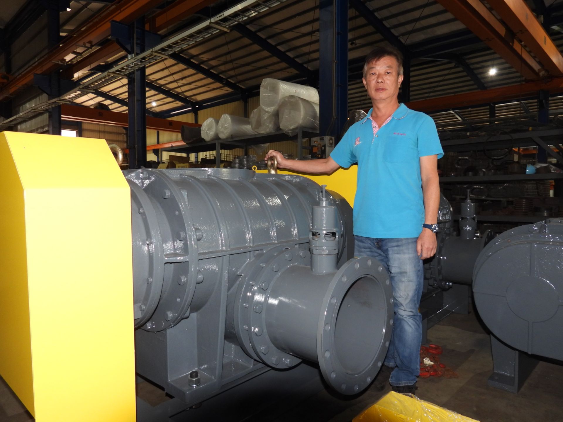 黑偉機械總經理林明賜身旁即為將要出貨的375(HP)大型鼓風機。圖/傅秉祥