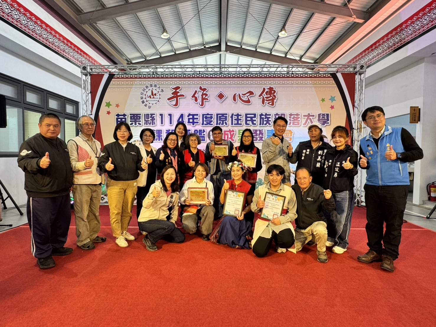 苗栗縣原住民族部落大學今(17)日假苗栗縣都會區原住民族綜合服務中心舉辦「114年度苗栗縣原住民族部落大學成果發表會」。活動開場由「苗栗縣原住民族及多元族群文化藝術舞蹈團」帶來精采舞演,傳達原住民族文化的生命力與藝術性。