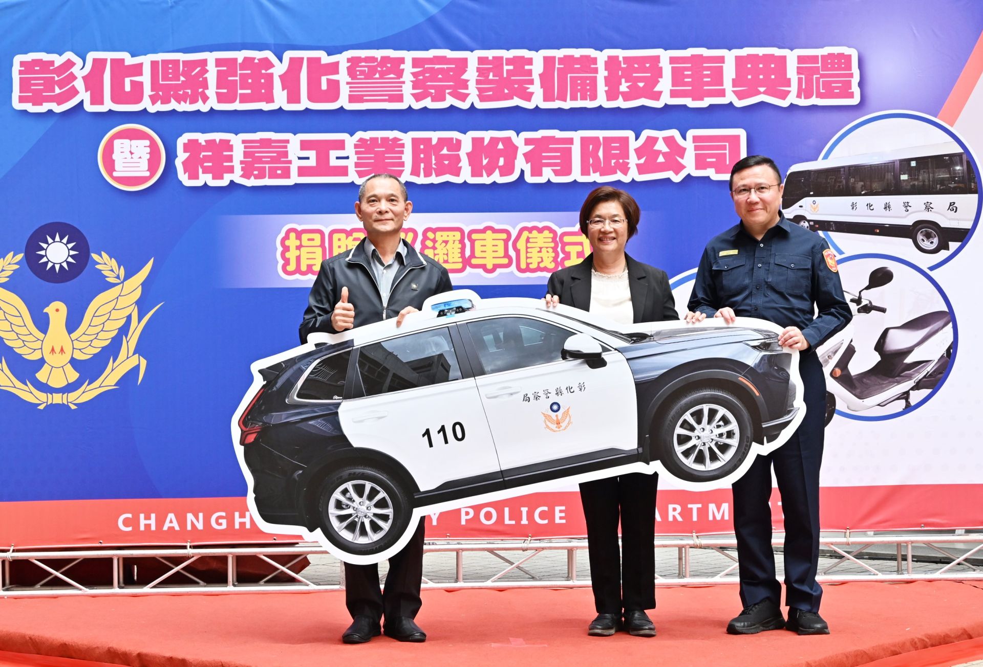彰化縣警察局17日在縣警局中庭舉辦「強化警察裝備授車典禮暨祥嘉工業股份有限公司捐贈巡邏車儀式」,共移撥縣警局車輛36輛、機車125輛,以及暨祥嘉工業捐贈一部120萬元巡邏車。王惠美表示,本次活動不僅見證縣府對警政工作的大力支持,祥嘉工業股份有限公司更慷慨捐贈一輛全新巡邏車,共同為提升彰化縣的治安與交通而努力。