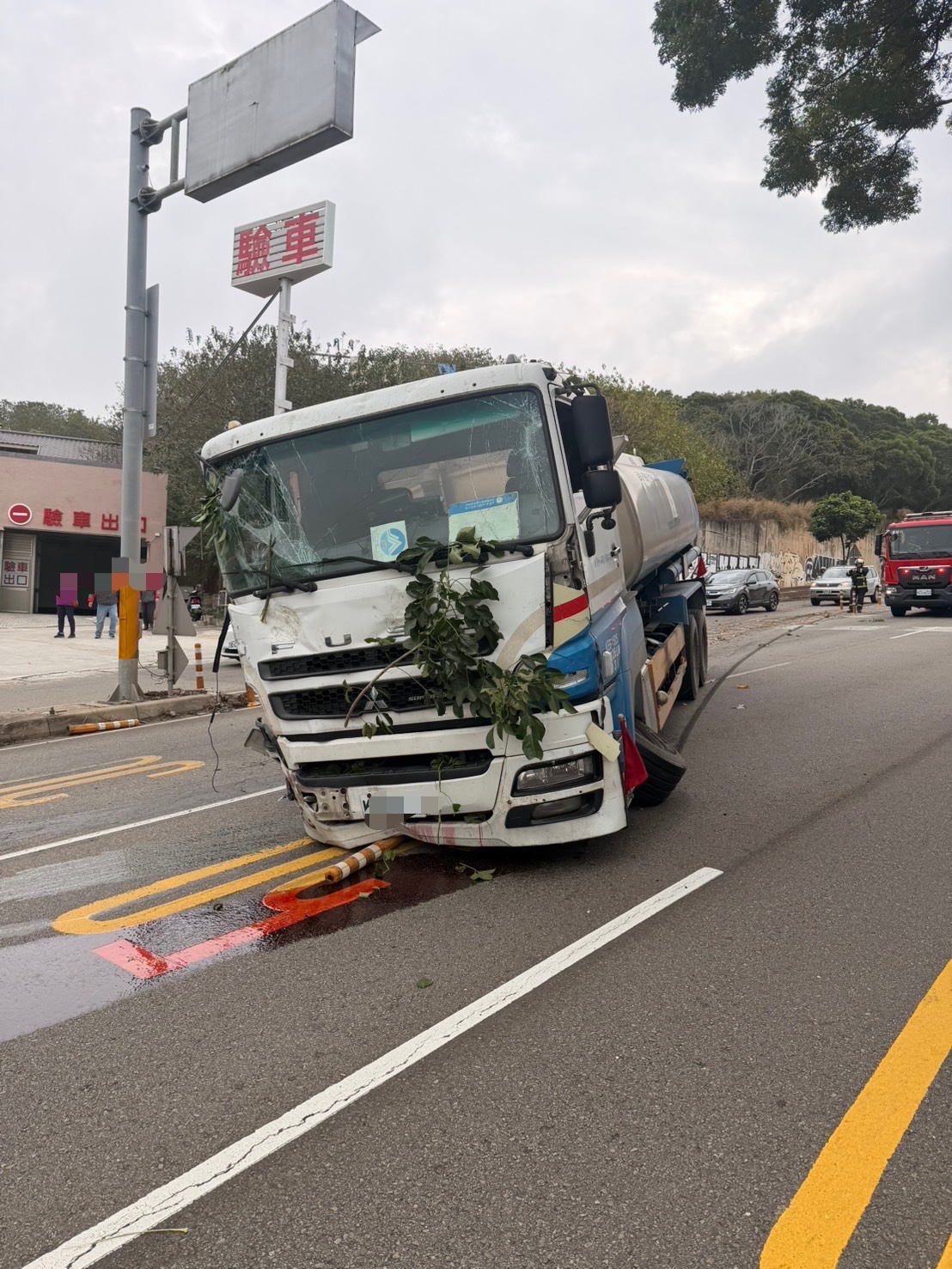 【Lai傳媒、記者爆料網/周庭慶/台中報導】台中市今(19)日發生油罐車自撞事故!台中市消防局11時54分獲報,龍井區向上路六段650號1輛油罐車自撞,立即派遣犁份分隊3車5人,由犁份分隊長李孝義帶隊前往救援。消防隊員到場發現油灌車自撞中間分隔島,駕駛無受困,該車損毀車頭,駕駛頭部外傷、意識清楚,給予必要急救處置後送往光田醫院向上院區救治。