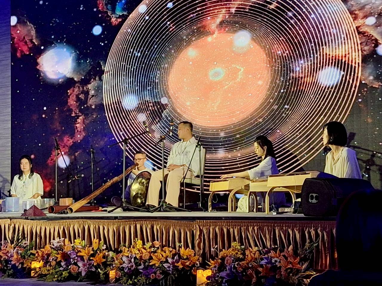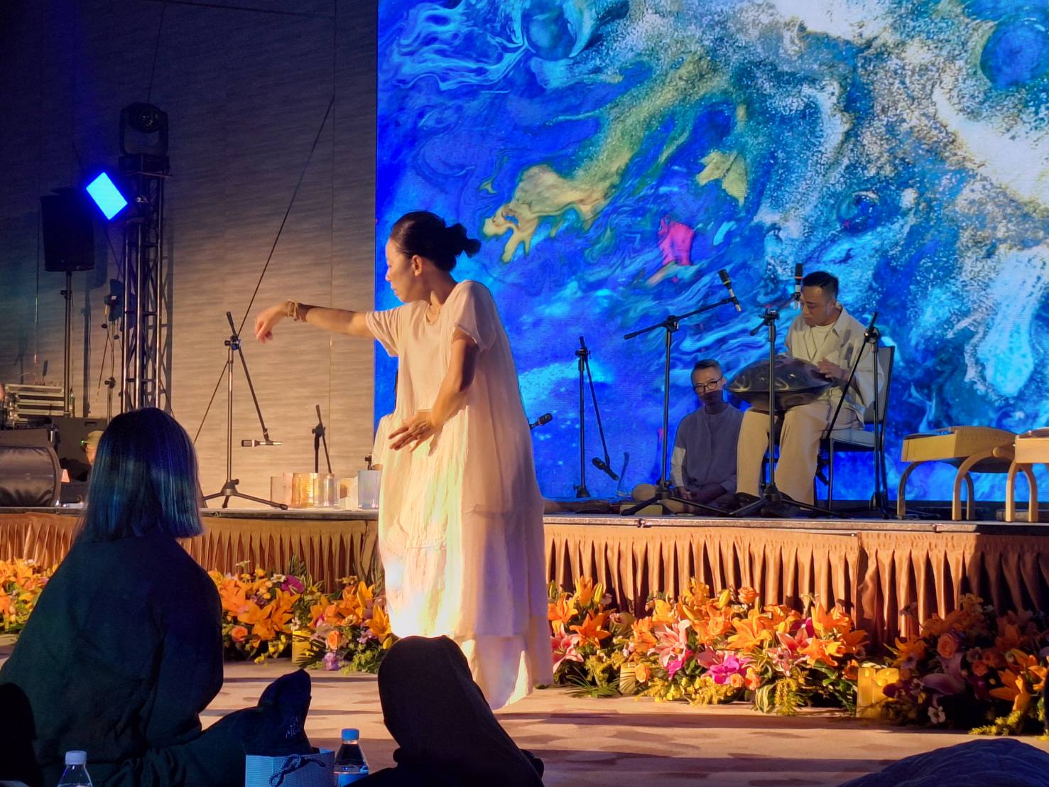 隨著音樂會進行,現場氛圍逐漸轉為安定。透過手碟、水晶缽、梵唱等聲響層次的鋪陳,觀眾在聲音引導下放慢呼吸,身體狀態亦隨之鬆緩。進入全球同步冥想儀式時段後,現場在引導下共同進入靜心狀態,聲音成為專注的依循,使觀眾能更清楚地覺察自身呼吸與身體感受。