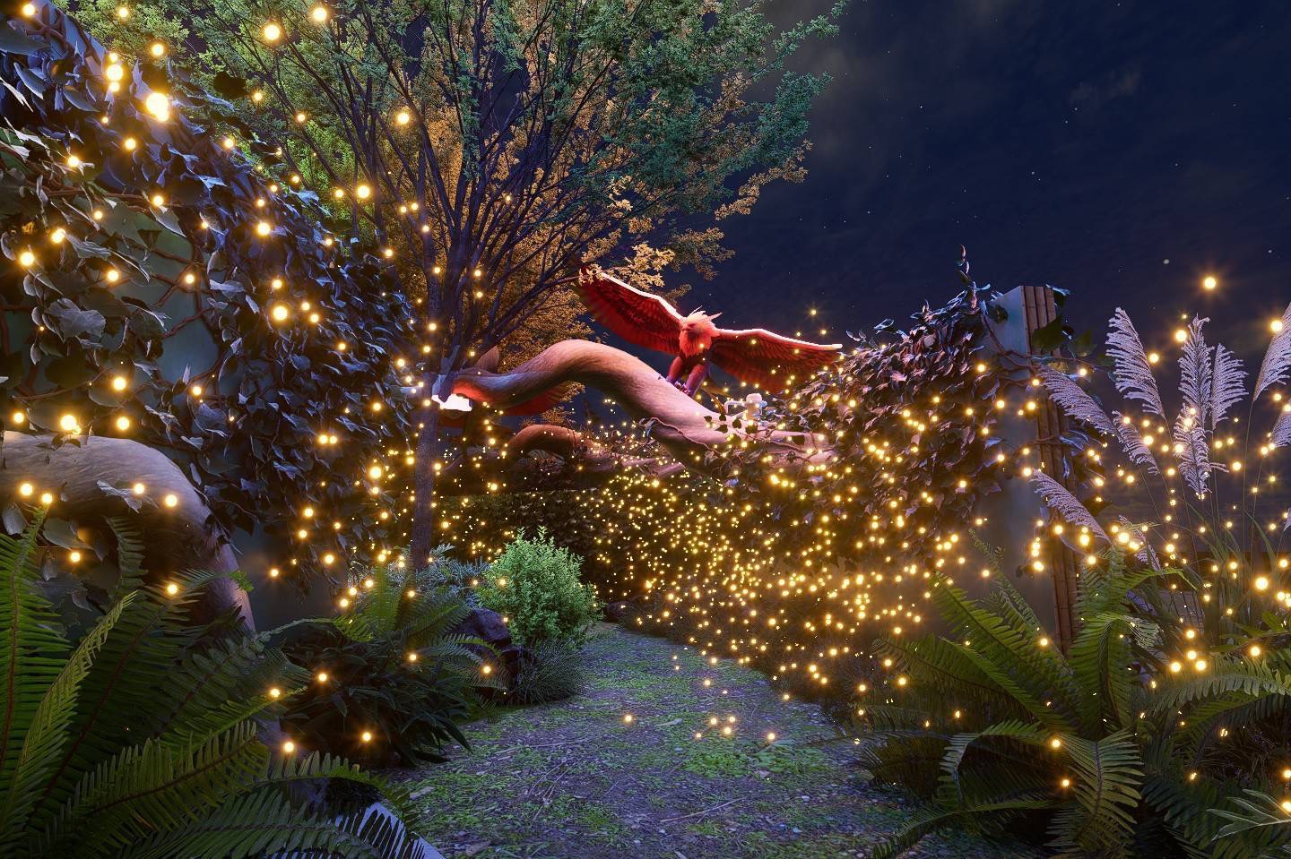 建設局說明,「驚蟄界」展區入口特別打造高達5公尺的「白馬」藝術裝置,以鐵件工藝結合織帶等多元媒材型塑巨型馬首,搭配層層光影設計,日夜呈現截然不同的視覺風貌。夜間在燈光映照下,龐大的馬身更顯神秘夢幻,宛如揭開通往異世界的序章。展區周邊同步營造沉浸式光環境,由主燈引導進入展區動線,沿途以火把燈鋪陳氛圍轉換,奇幻色彩在樹木間流動,彷彿森林甦醒,帶來迷離而震撼的感官體驗。