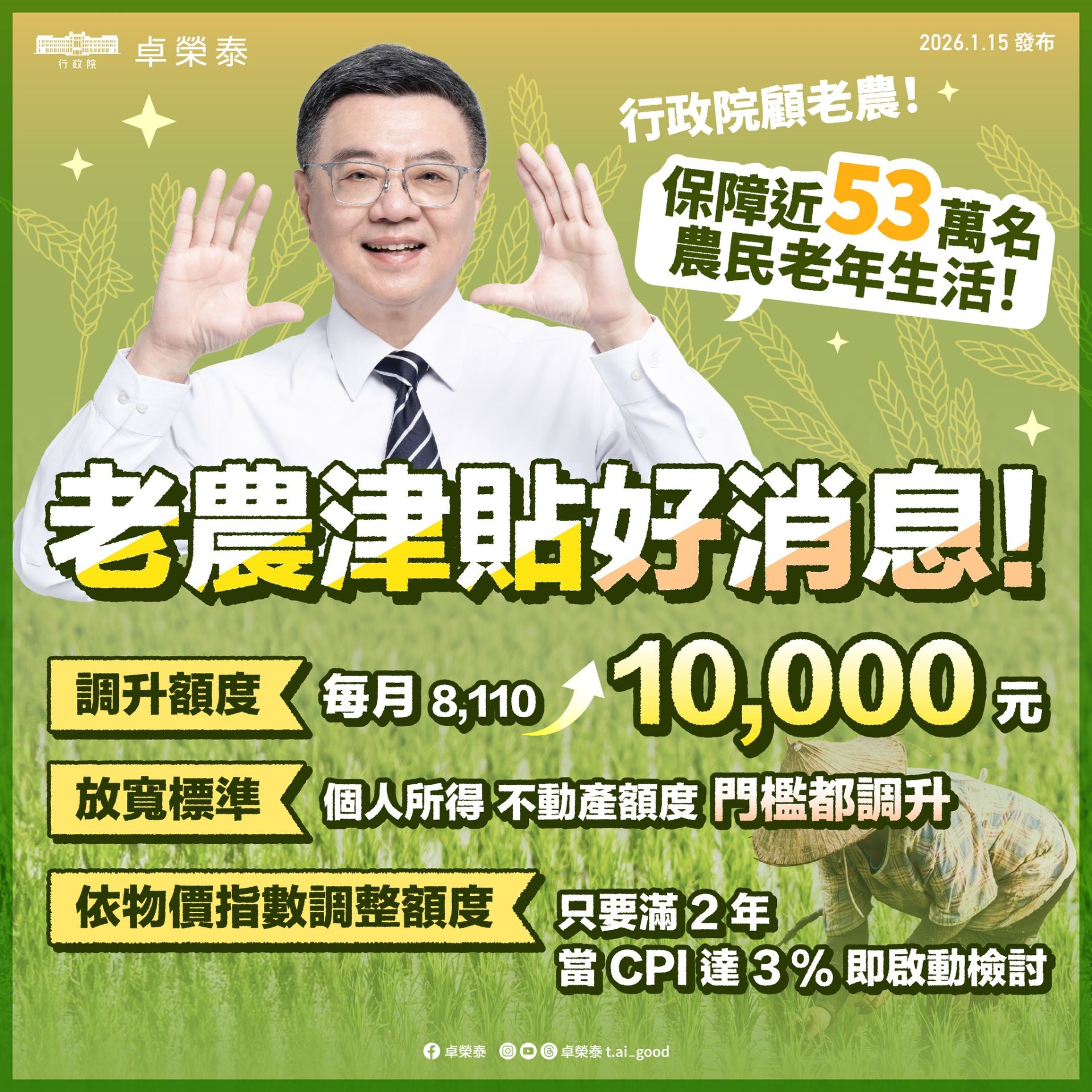 農業部表示,考量近年物價持續上漲,現行老農津貼發放額度已難以充分支應基本生活所需,爰規劃將發放額度由現行每月8,110元調整至1萬元,使津貼水準更貼近現行生活成本,實質照顧老年農民基本生活需求。另依老農津貼暫行條例第4條規定,原採每4年依消費者物價指數(CPI)成長率調整一次,惟因基期偏低,調整幅度有限,難以即時反映物價波動,除直接調升額度外,另增訂額度檢討機制,於定期調整後2年CPI累計成長率達3%即啟動調整程序,以維持老年農民實質購買力,建立更具彈性與即時性的制度。