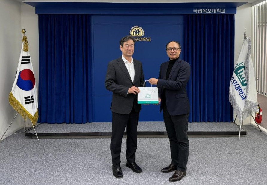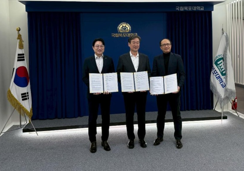 圖1、臺灣風訓公司115年1月15日於南韓全羅南道與南韓國立木浦大學簽署MOU。(左:盧展猷董事長、中:韓國國立木浦大學宋河哲校長、右:TÜV SÜD Korea 徐正旭執行長)。