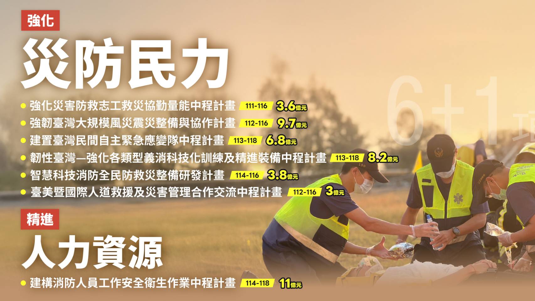 劉世芳表示,中央全力支持消防建設與發展,已有階段性成果,例如在消防廳舍方面,112年至114年完成改善屋齡20年以上之消防廳舍內裝環境151處,優化消防同仁備勤環境;在消防車輛裝備器材方面,113至114年完成汰換消防車輛139輛,購置紅外線熱顯像無人機組88組、救災機器人88台,強化救災量能;在人力資源方面,於113至114年增補1,277名消防人力,目標113年至117年要增補3,000名消防人力,並補助地方消防機關建立職安輔導團隊,持續優化消防人力。