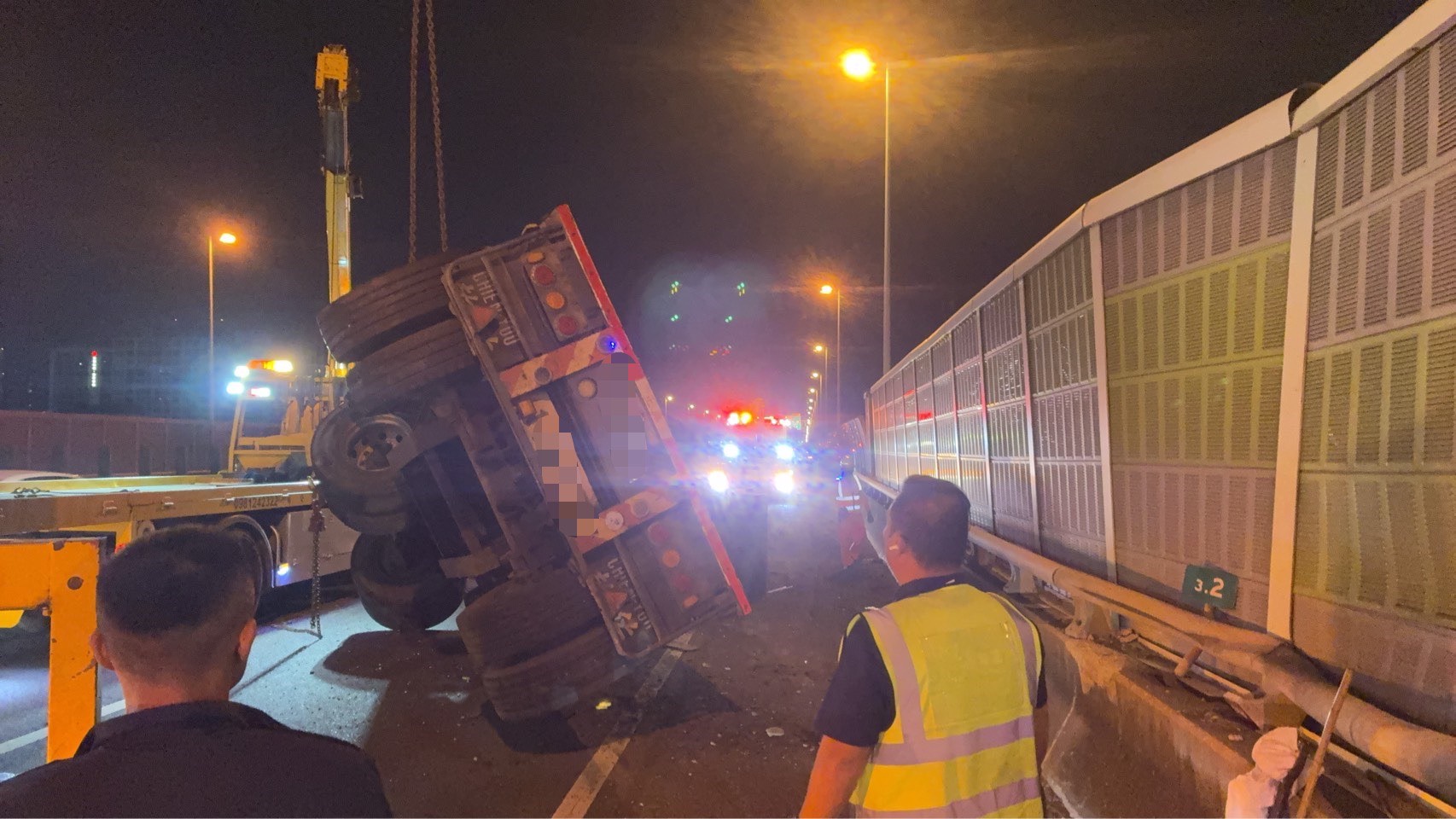 第五公路警察大隊表示,76年次潘姓男子駕駛營業全聯結車,行駛於外側車道時,疑似聯結器斷裂脫落,導致車上鐵圈散落路面,佔據車道。事故發生後,另一輛板車(車號1*-*Z)因撞擊外側護欄,整輛車側翻在外側車道上,現場一度交通受阻。
