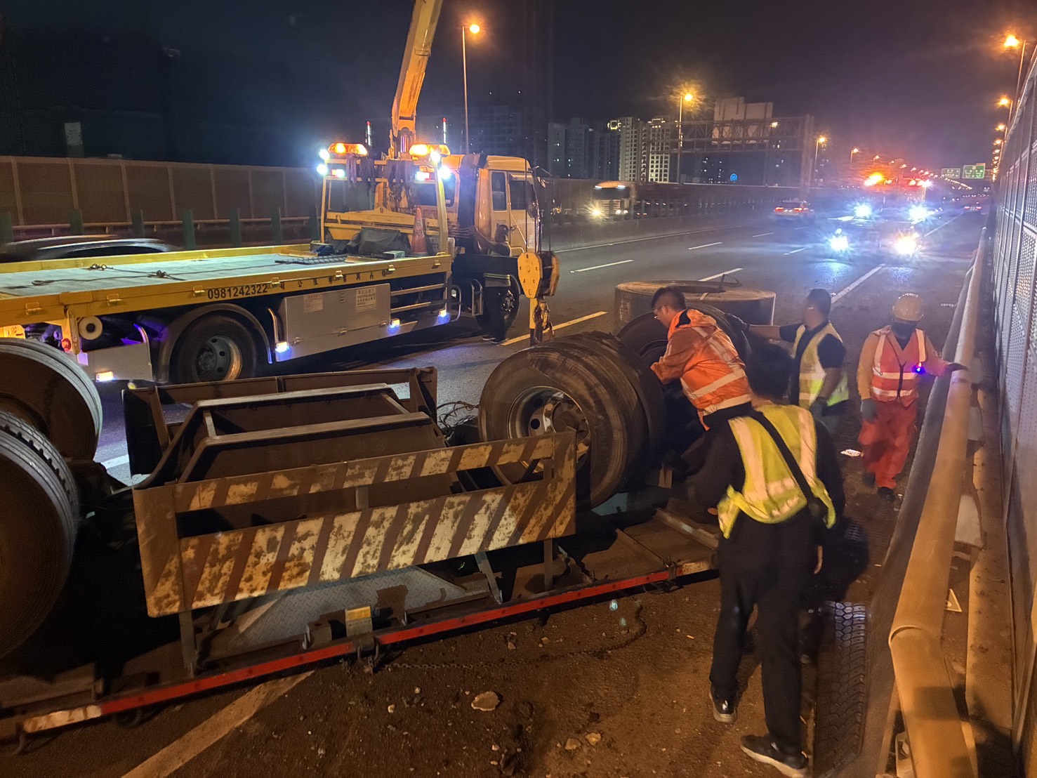 國道10號驚魂夜!聯結車故障鐵圈掉滿地 板車撞護欄側翻