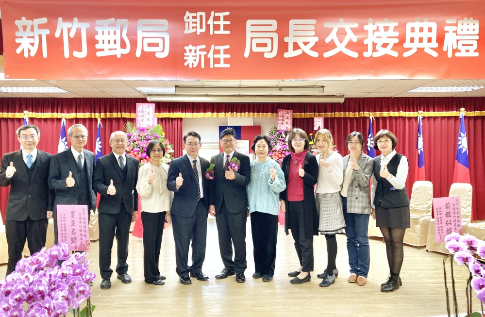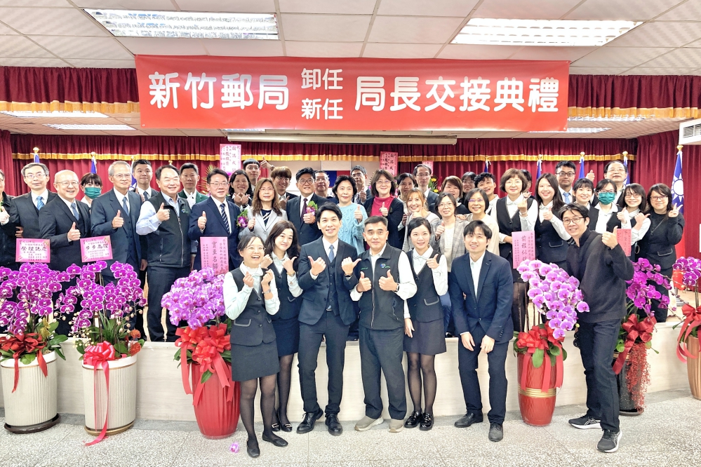 ▲新竹郵局今(1/15)日舉行卸、新任局長交接典禮,監交人中華郵政副主任委員王婉如、原任局長並榮陞桃園郵局局長吳進益、新任竹郵局長沈佛龍)和與會貴賓、竹郵同仁們合影。