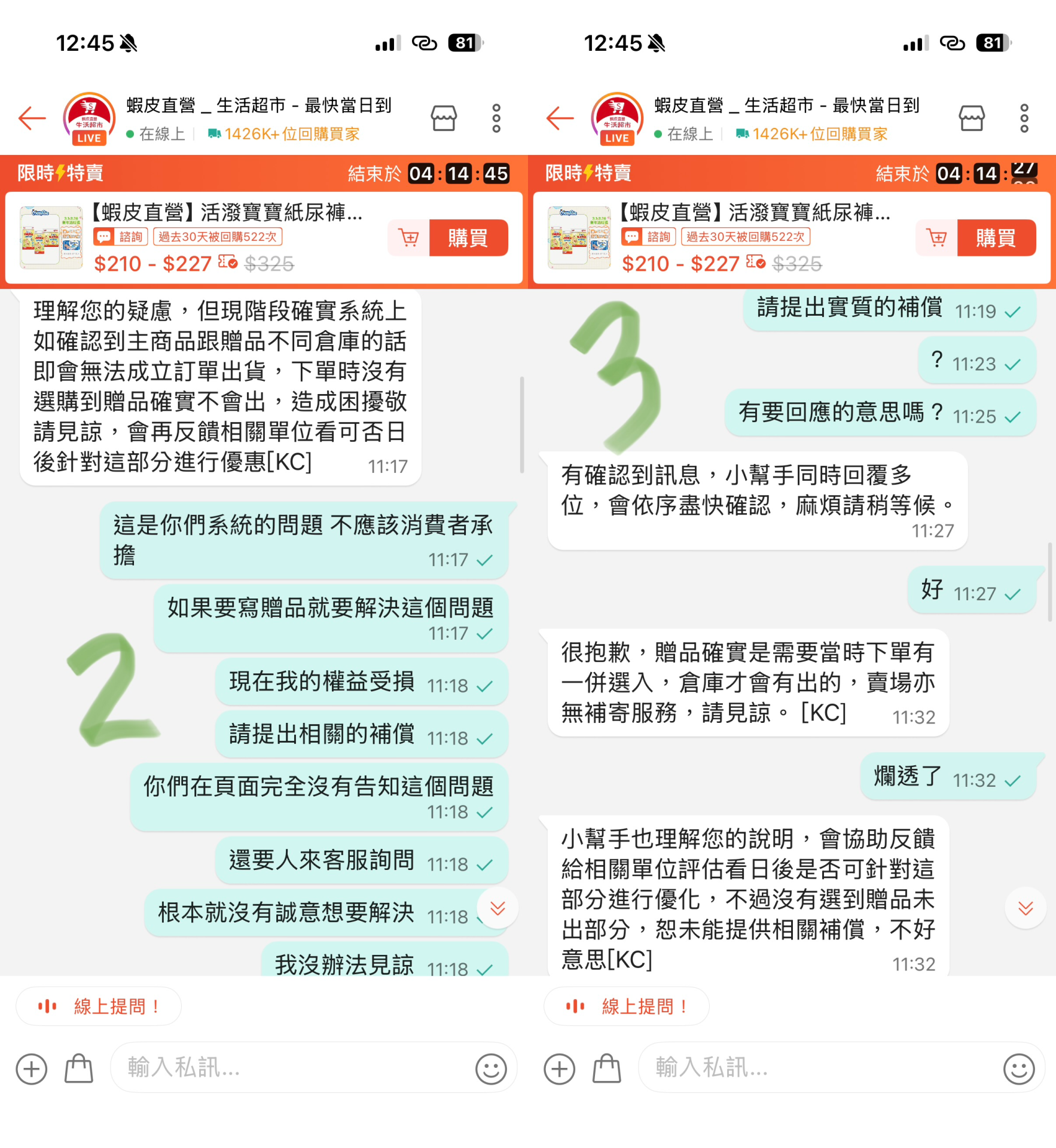 「贈品看得到領不到」?系統結帳卡死、客服稱「倉儲不同」拒補寄,讓消費者氣炸。爆料人提供