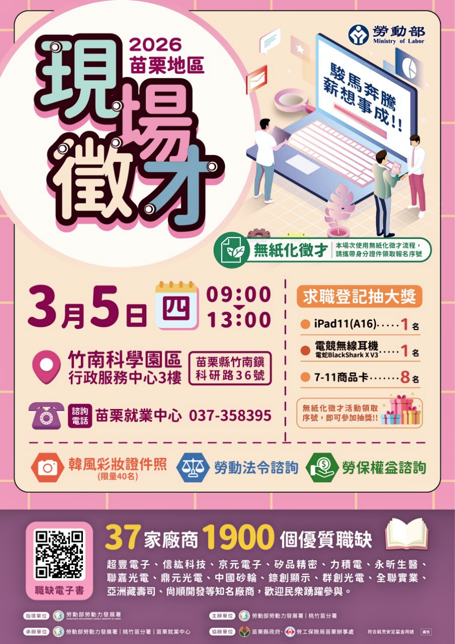 助失(待)業民眾年後順利就業機會 桃竹苗分署苗栗地區3/5、3/21徵才共計釋出2900個工作機會