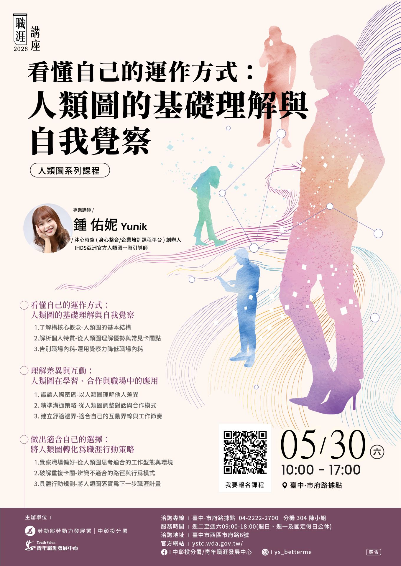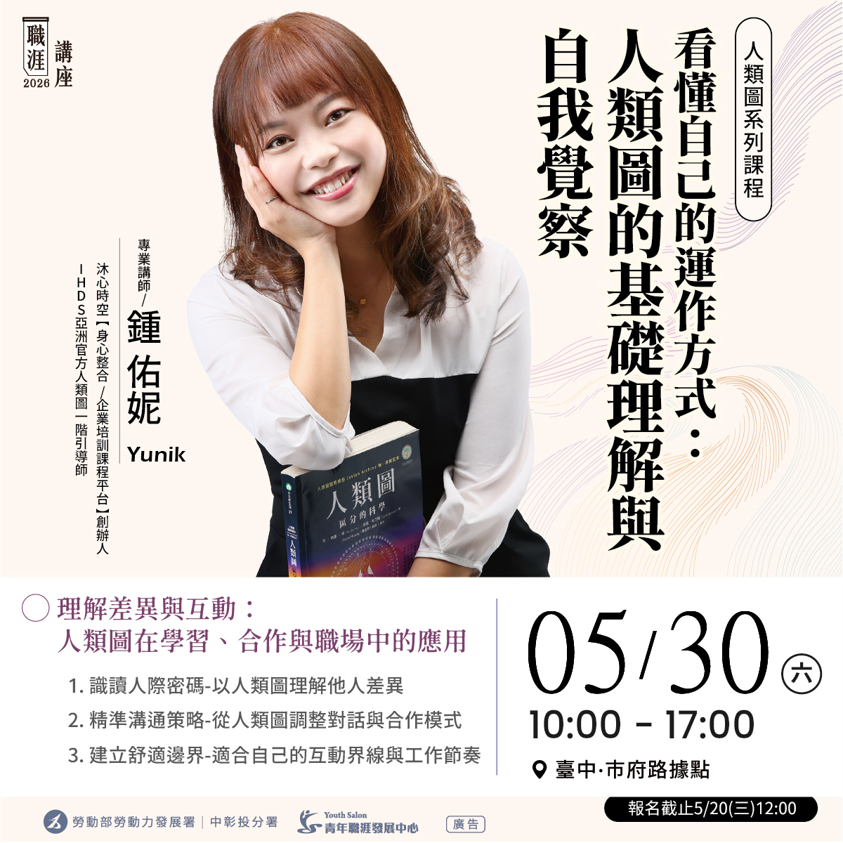 該中心正式邀請知名身心整合與企業培訓平台「沐心時空」創辦人、同時也是 IHDS 亞洲官方人類圖一階引導師的鍾佑妮(Yunik)老師,於 5 月 30 日在台中市府路據點,舉辦一整天的「人類圖系列課程」。這場名為「看懂自己的運作方式:人類圖的基礎理解與自我覺察」的深度講座,將帶領學員從天賦設計圖出發,精準定位職場優勢。
