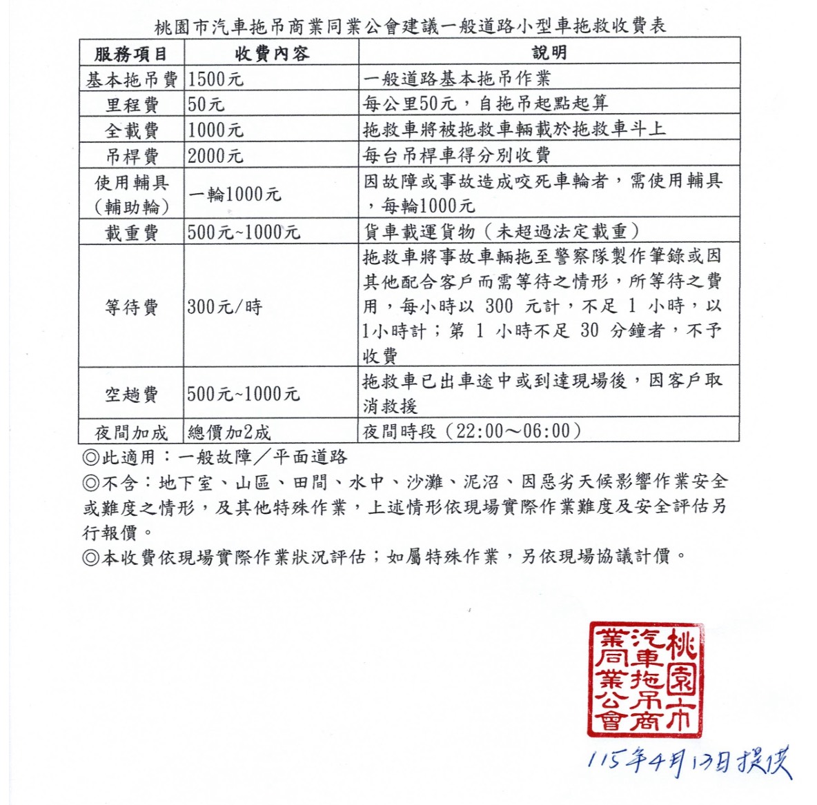 桃園市公布道路救援車輛(汽機車)拖救處理指引及公會推薦廠商名冊供民眾參考