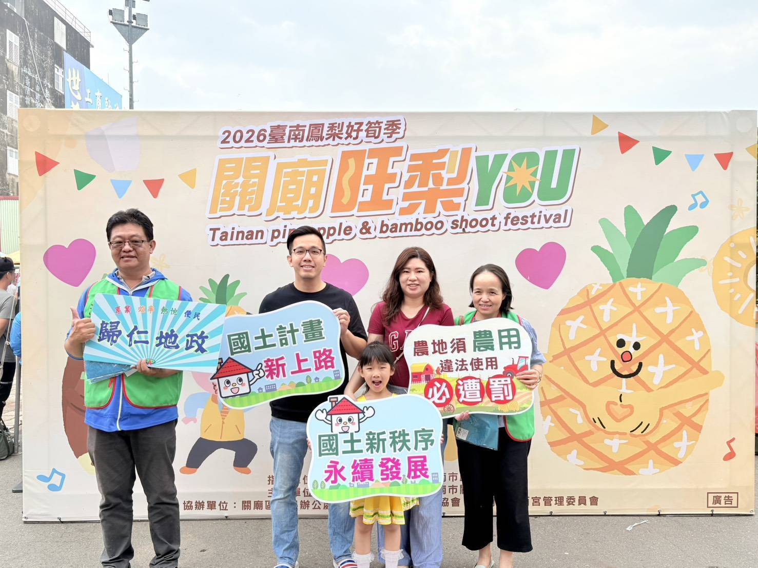 「2026臺南鳳梨好筍季農業產業文化活動-關廟旺梨YOU」於4月25日在關廟區山西宮廣場熱鬧登場,結合在地盛產的「鳳梨」與「竹筍」,推廣農產、觀光與農村文化,現場有精彩表演、趣味闖關、好玩DIY、散策集章、可樂FUN送及農萊市集等多項活動。臺南市歸仁地政事務所也把地政服務帶進活動市集,在活動現場設置宣導攤位,向民眾宣導「農地農用」觀念、非都市土地合法使用等規定,以及如何辦理更正編定等相關資訊,讓民眾在活動市集玩樂之餘,也能輕鬆了解土地合法使用規定與自身相關權益。
