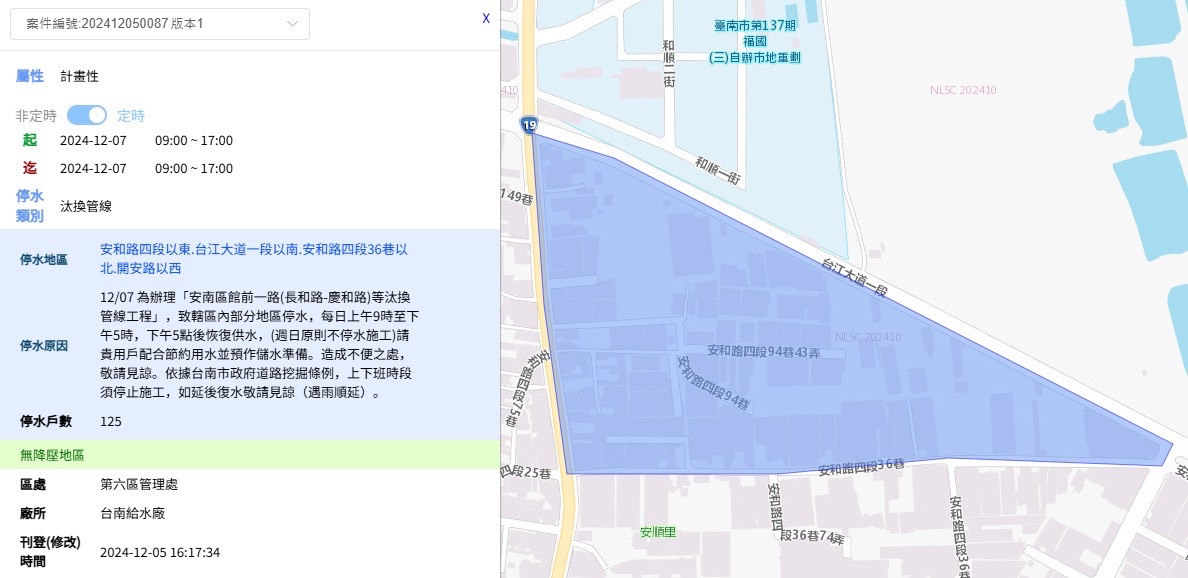 安和路四段36巷、89巷、106巷。台江大道1段及安和路四段38號-120號,請用戶及早準備儲水備用。
