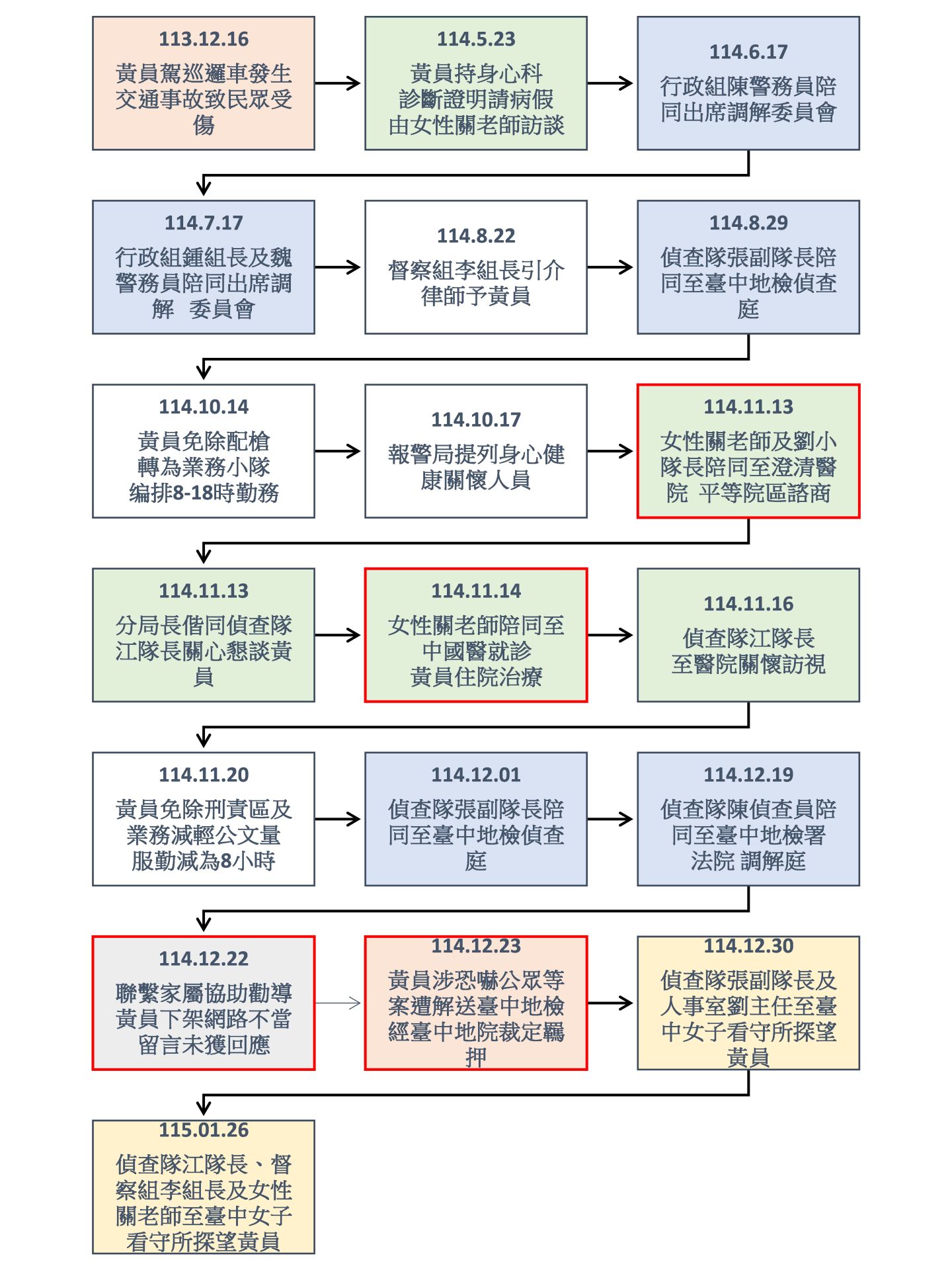 台中市警二分局列出黃姓女警相關事件時序表。翻攝畫面