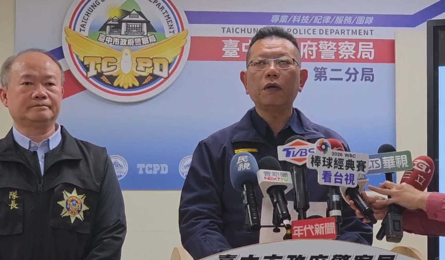 針對遭指控對黃姓女偵查佐霸凌,台中市警二分局副分局長陳聖偉(右)、偵查隊長江清萬(左)說明。翻攝畫面