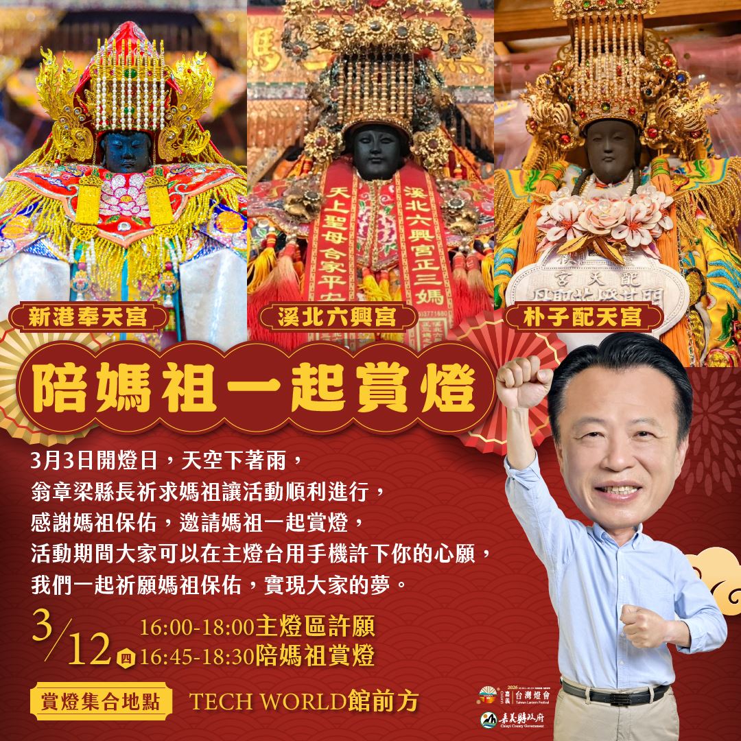 (記者 黃珮綺/嘉義報導) 2026台灣燈會持續在嘉義展出,嘉義縣政府將於3月12日舉辦「陪媽祖一起賞燈」活動,邀請民眾與媽祖一同走入燈區,共同感受燈會璀璨燈景與熱鬧氛圍。