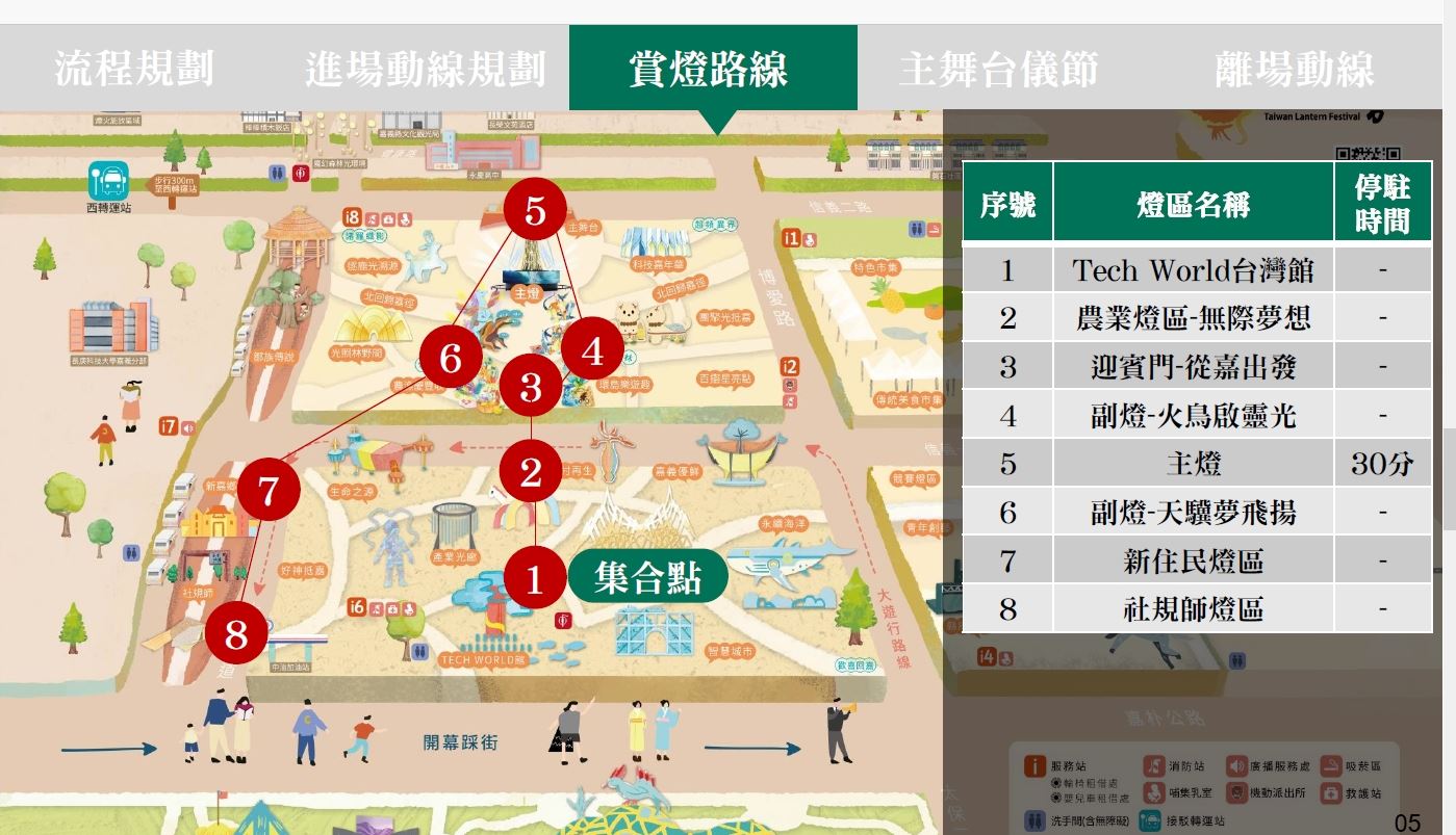 媽祖將於下午4時45分自TECH WORLD館前集合出發,沿途停留農業燈區與主燈區,並在主燈區為民眾祈福,祝願大家心願成真。隨後將走入新住民燈區及社規師燈區,陪伴民眾漫步燈區,共同體驗燈會的熱鬧氛圍。