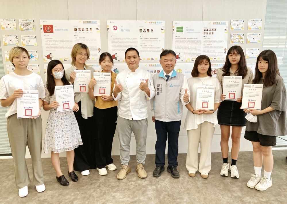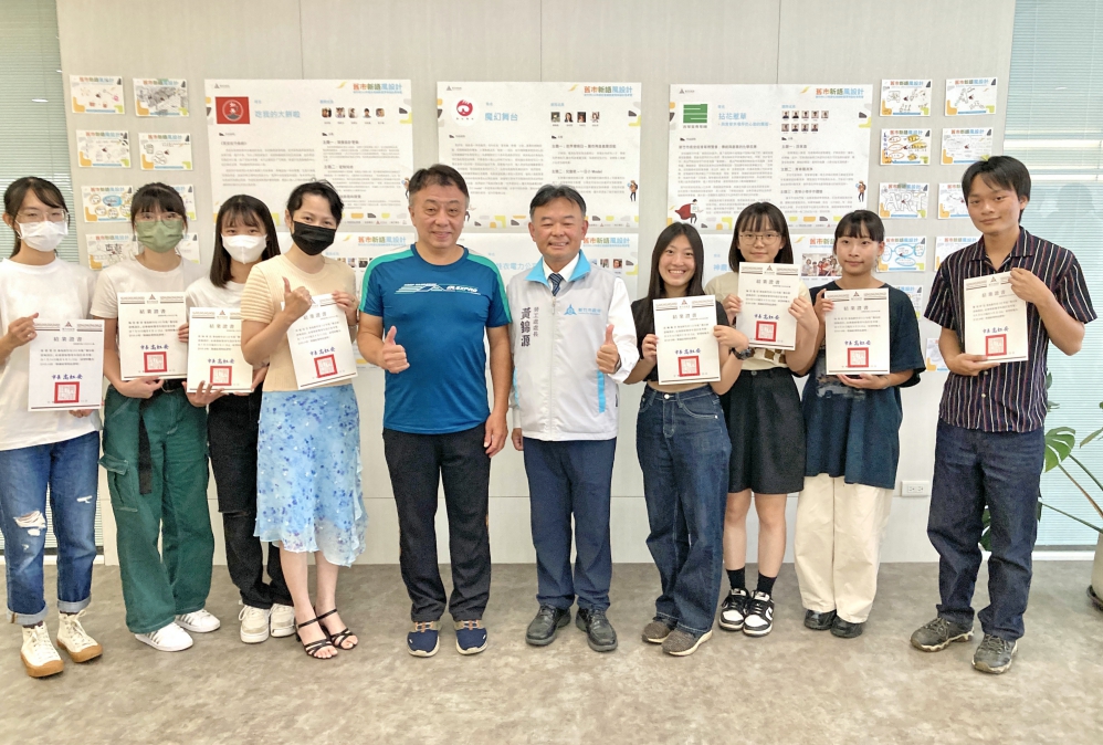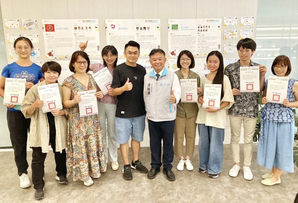▲竹市「舊市新語風設計」青年設計思考營成果展,學員發表以竹市長安街為原型的「青草博覽會」未來概念平台創意設計構想,最後由竹市府勞工處長黃錦源(右5)和業者(左5)頒發結業証書予學員。