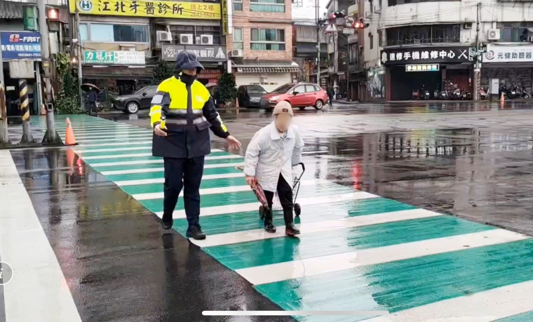 汐止分局暖警攙扶老婦人過斑馬線。(圖/汐止分局提供)